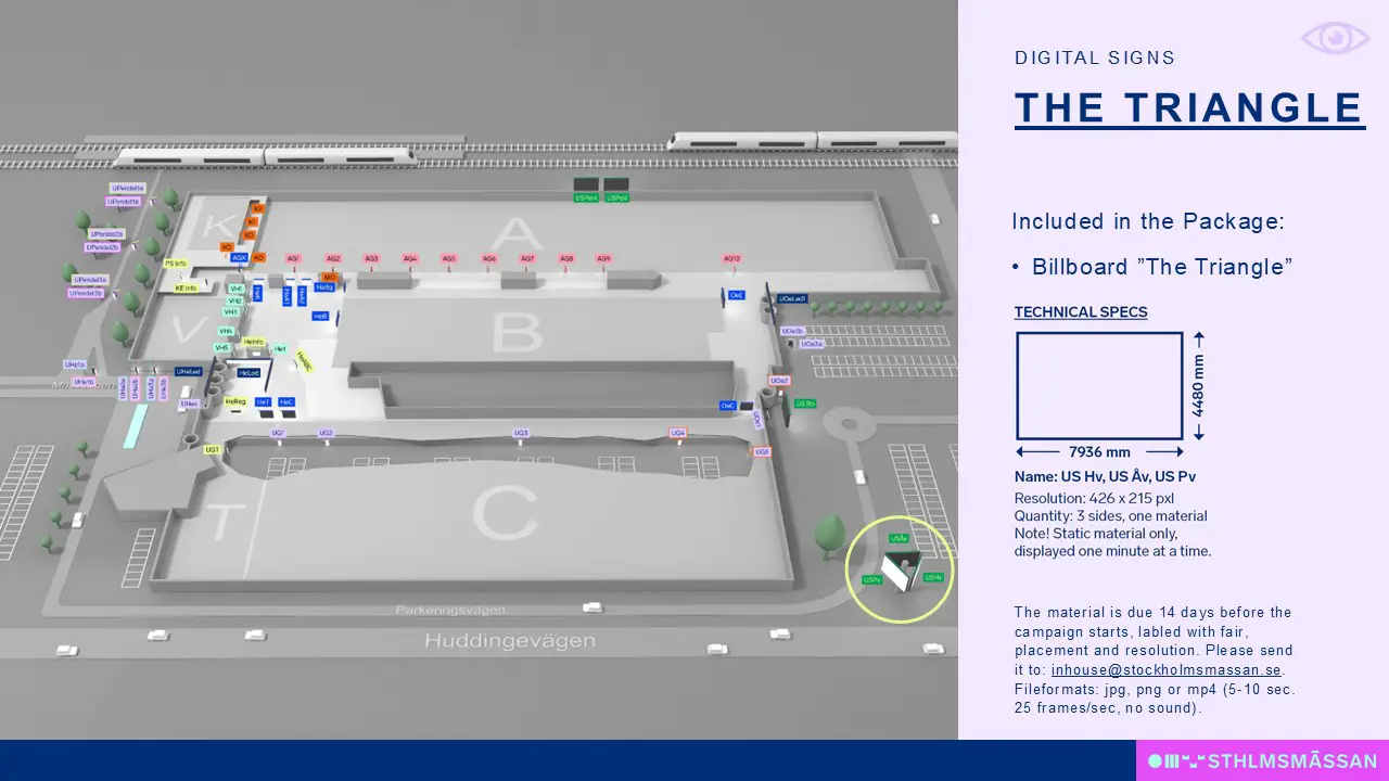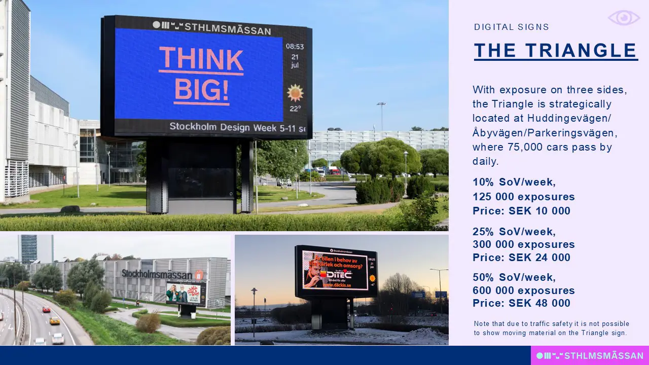 With three-sided exposure, The Triangle is strategically positioned at the intersection of Huddingevägen, Åbyvägen and Parkeringsvägen, where around 75,000 vehicles pass each day.