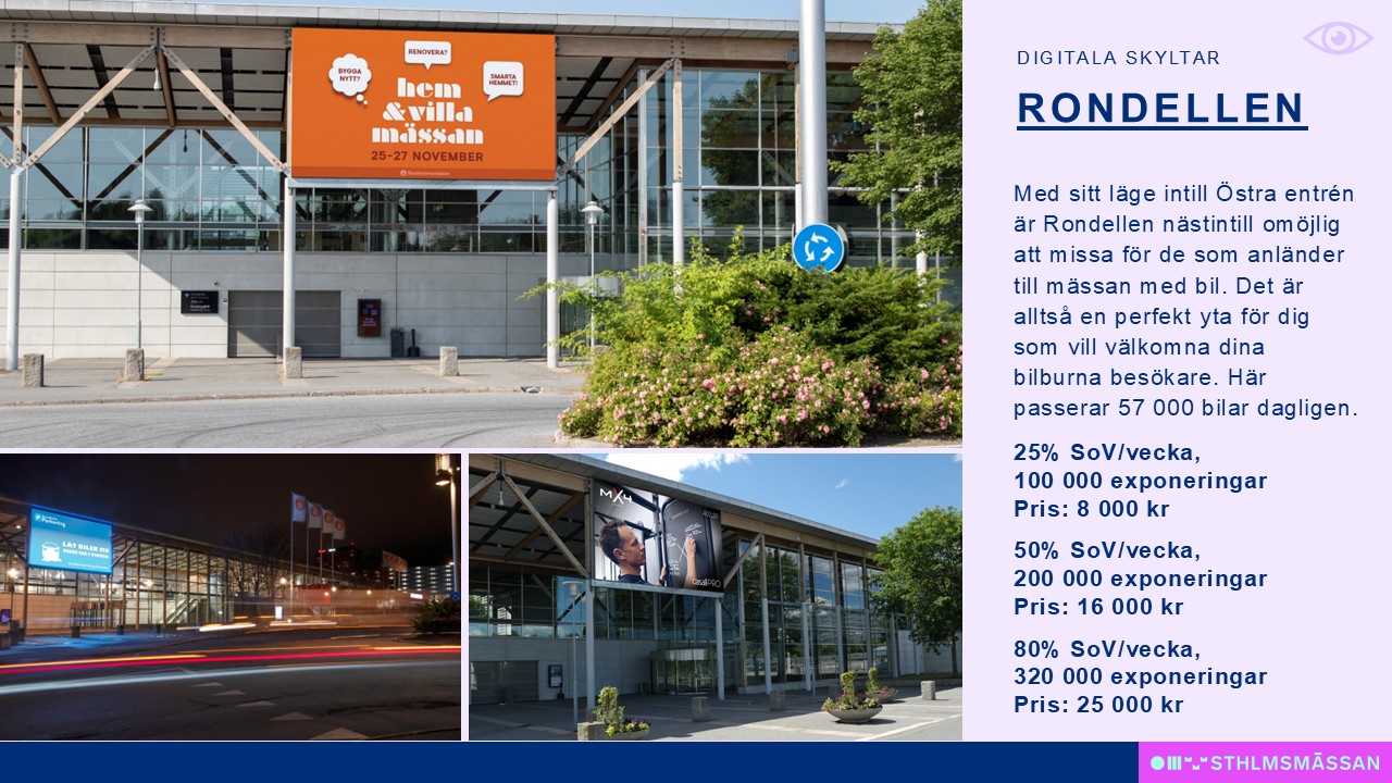 Med sitt läge intill Östra entrén är Rondellen nästintill omöjlig att missa för de som anländer till mässan med bil. Det är alltså en perfekt yta för dig som vill välkomna dina bilburna besökare. Här passerar 57 000 bilar dagligen.