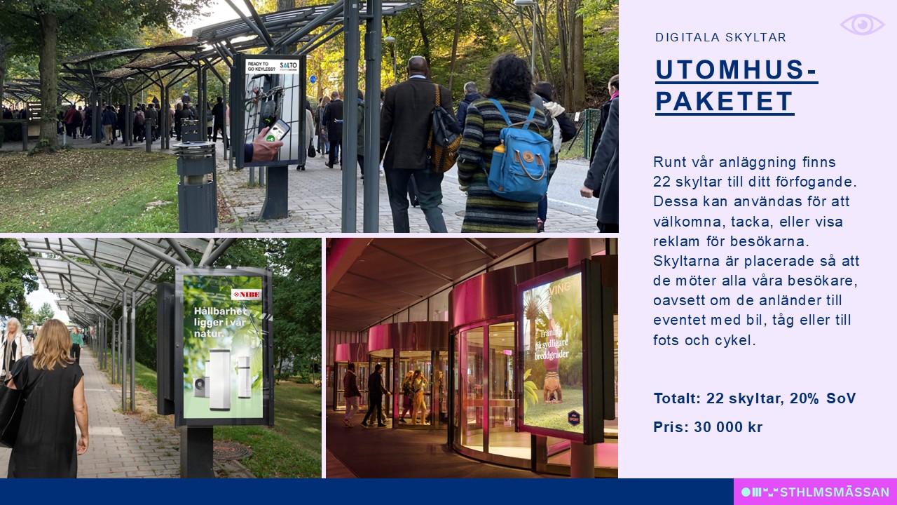 Runt vår anläggning finns 22 skyltar till ditt förfogande. Dessa kan användas för att välkomna, tacka, eller visa reklam för besökarna. Skyltarna är placerade så att de möter alla våra besökare, oavsett om de anländer till eventet med bil, tåg eller till fots och cykel.